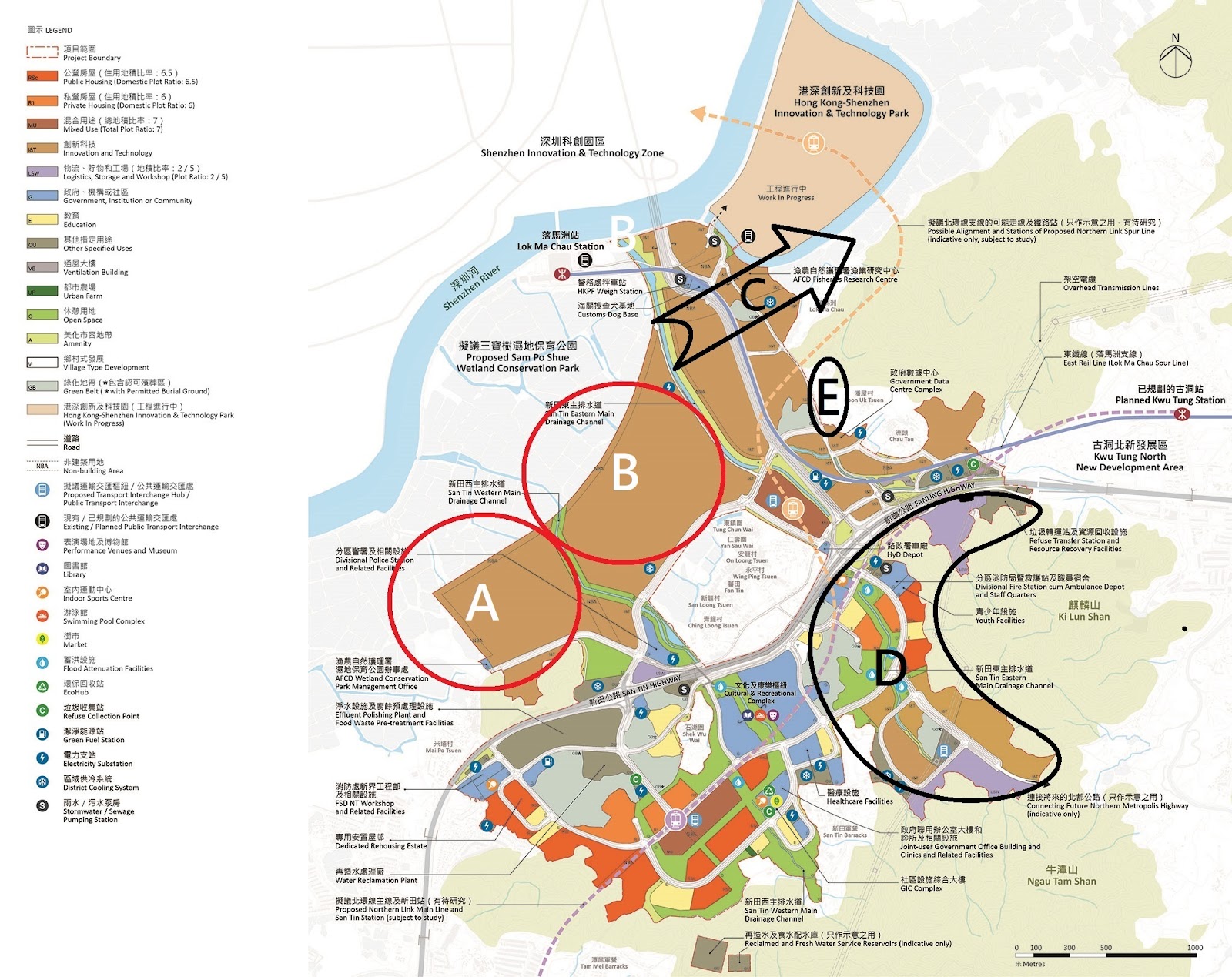 根據初步檢視,設若新田科技城的需要新增「創新科技」土地,其實可以選用圖2-D(包含佔用了原本作創新科技用途的物流、垃圾站、住宅、休憩用地之類)和2-E(棕地)地方,關鍵只在政府自行掌握的優次。